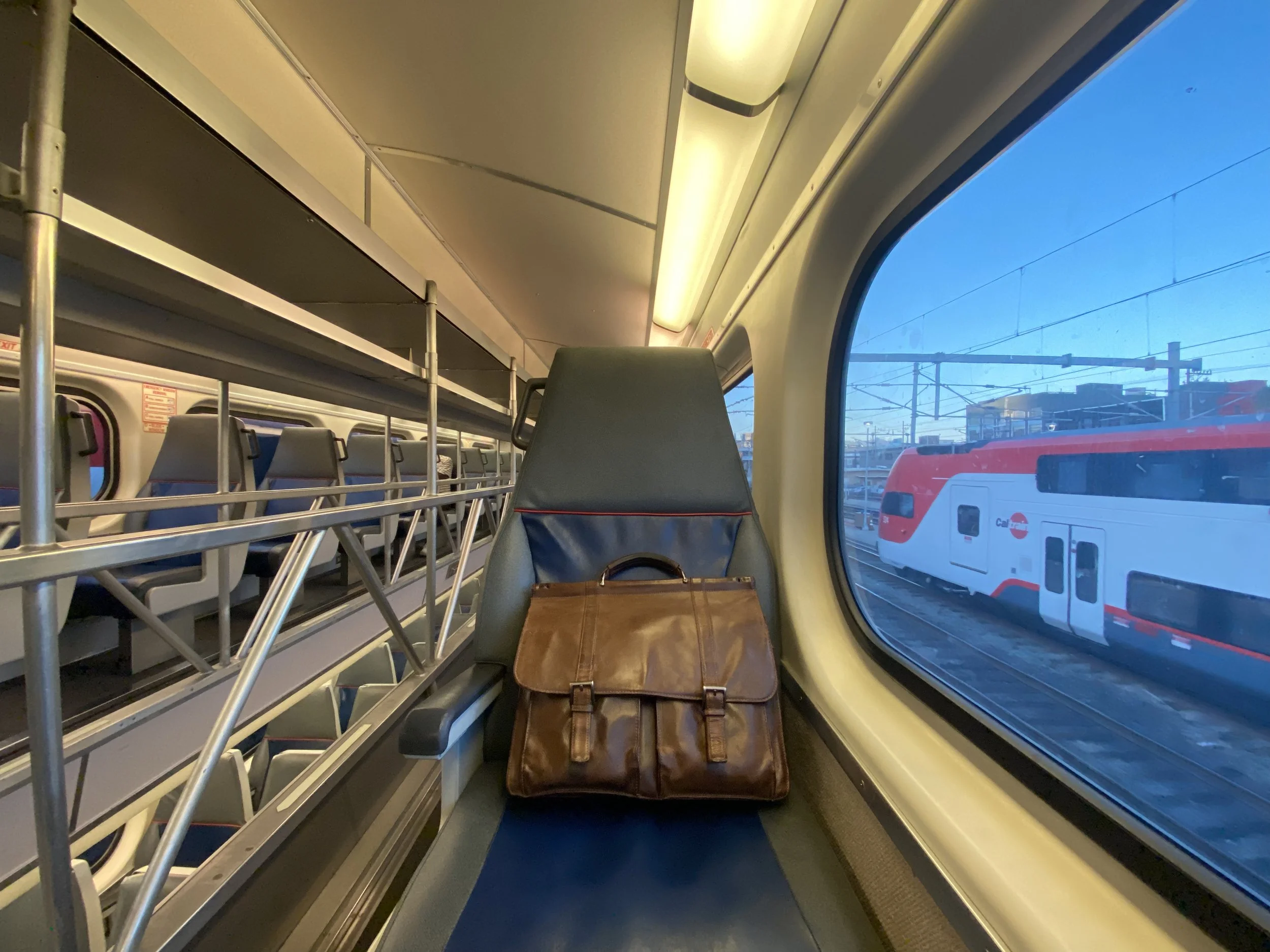 at the front door of the rear car, hurtling into the future, propelled by the engine in the back